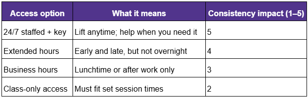 Finally, the best setup shrinks friction. Parking is easy, doors open when you are, and classes are on when training is on the cards. With that sorted, you can give your health a red-hot go without burning daylight or motivation.